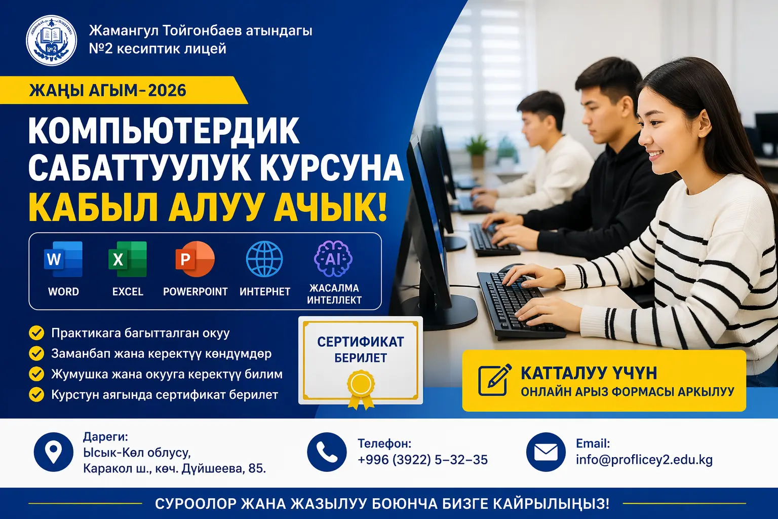 Жамангул Тойгонбаев атындагы №2 кесиптик лицей «Компьютердик сабаттуулук жана офис программалары» боюнча жаңы окуу агымына каттоону ачты!